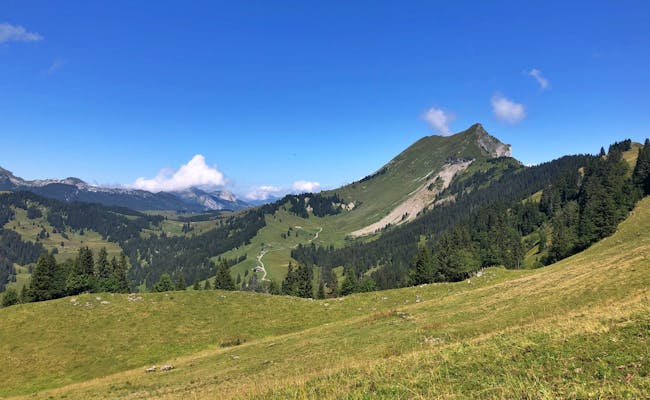 Diese anspruchsvolle Tour beginnt am Harder Kulm an der Bergstation der Harderbahn in Richtung Nordosten. Für ungeübte Berggeher ist eine geführte Wanderung anzuraten. Der Weg führt durch den Nadelwald und steigt stetig an. An einer Alpwiese ist die Aussicht auf Interlaken und die beiden Seen vor der Bergkulisse möglich.