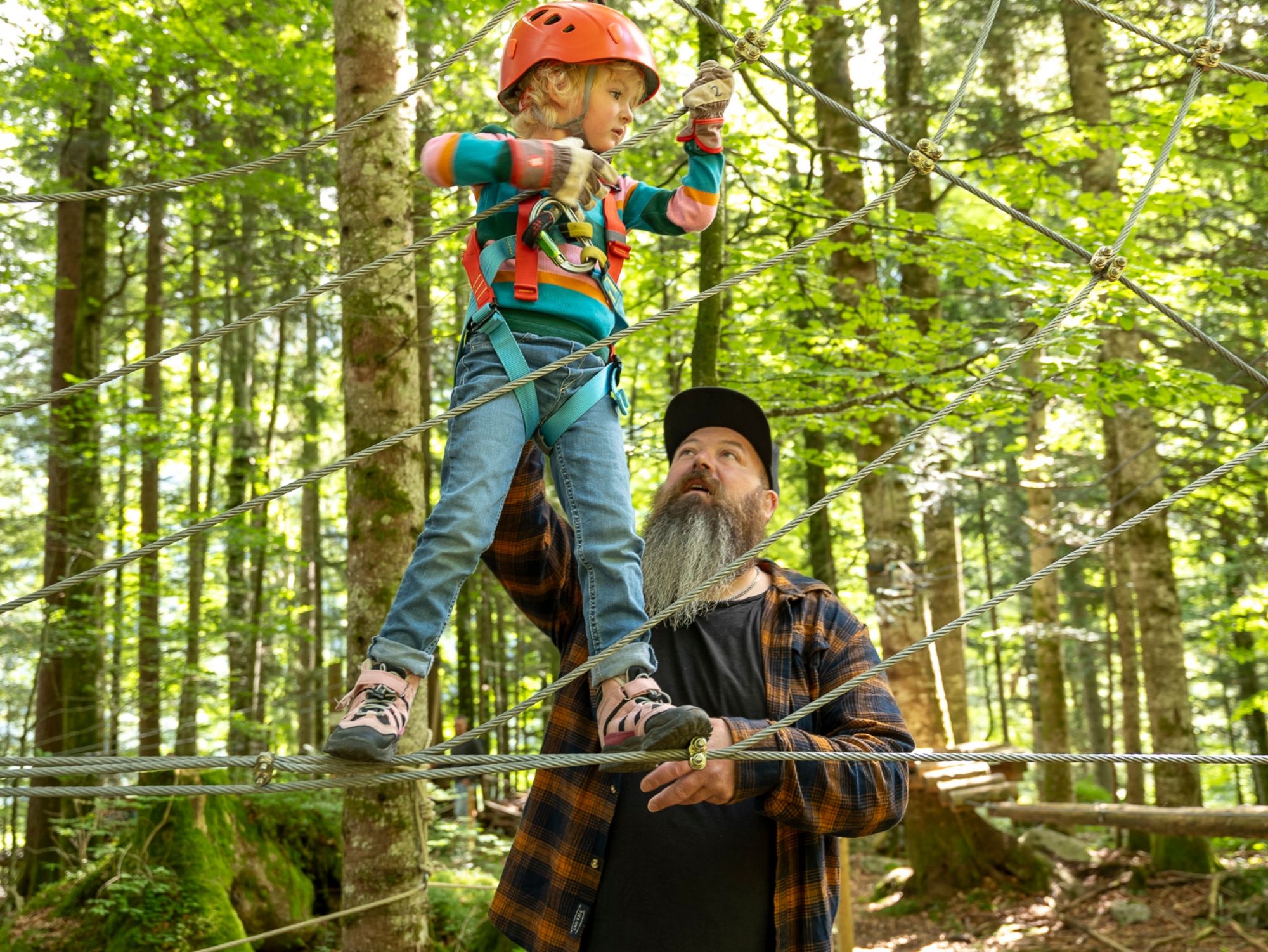 Средние и более сложные маршруты требуют большей силы, гибкости и отсутствия страха высоты. Лазательные элементы, такие как настилы, сети и канатные дороги, соединяют платформы между деревьями. Так создается разнообразное предложение, подходящее для школьных групп, компаний и отдельных посетителей.