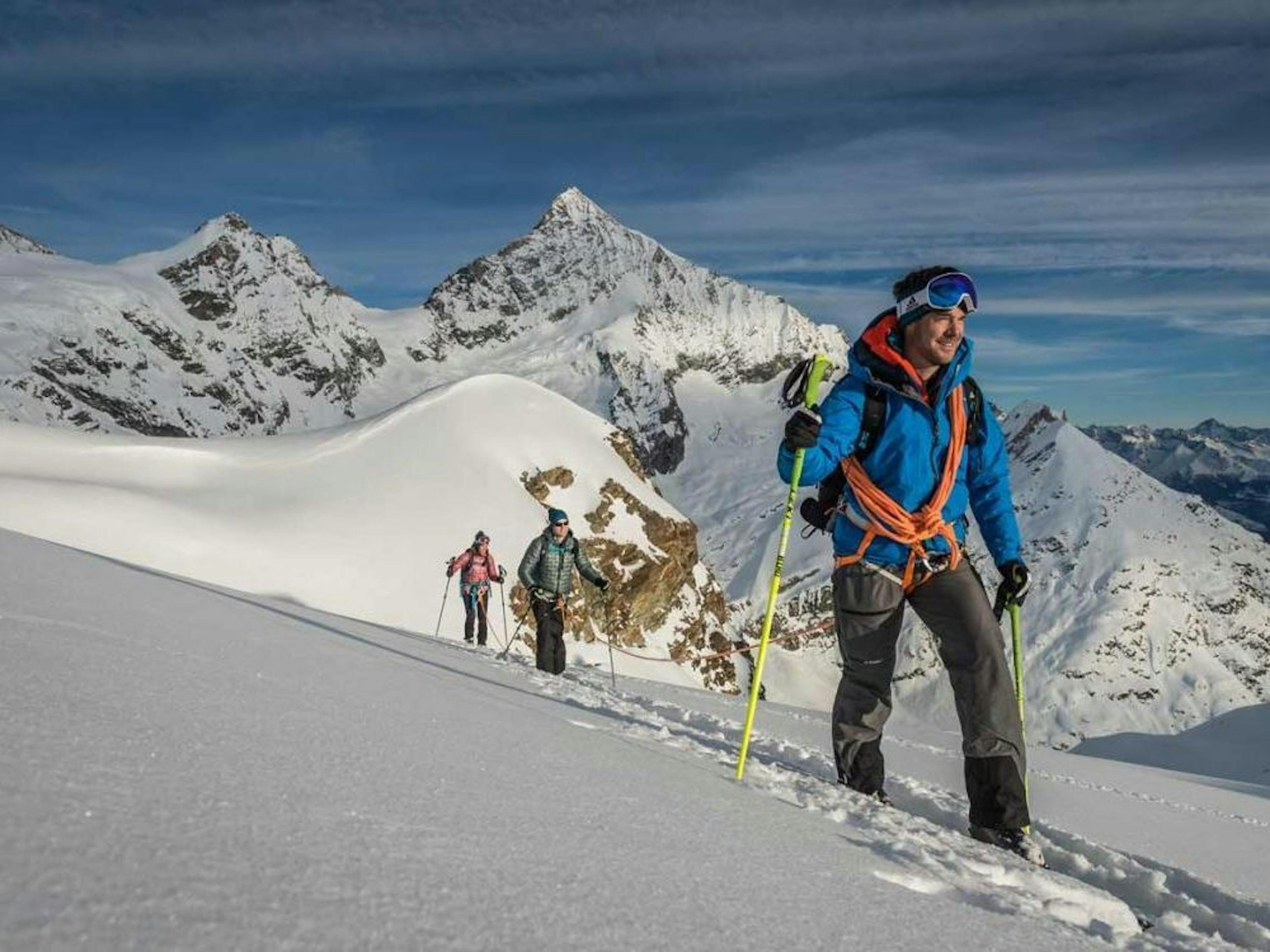 Лыжный тур в Швейцарии с снежными ботинками по высокогорьям, ловкие лыжники, ясный обзор
